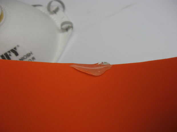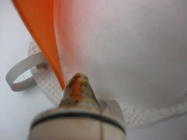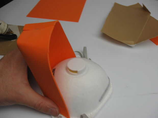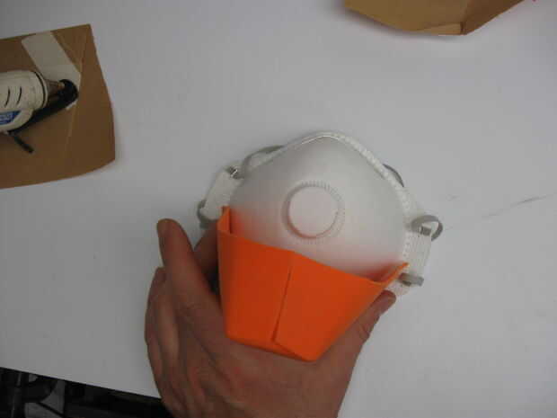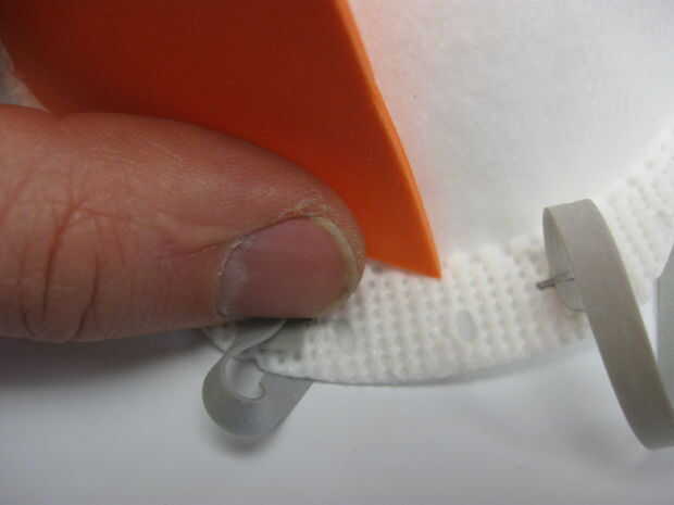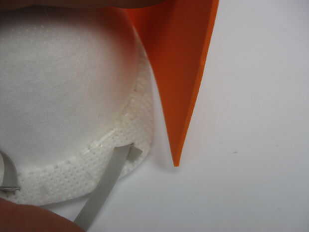 Pegamento caliente el centro de la parte inferior de la quijada a la máscara y seguir pegar en los lados derecho e izquierdos hasta que la mandíbula inferior se sujeta firmemente a la máscara.
