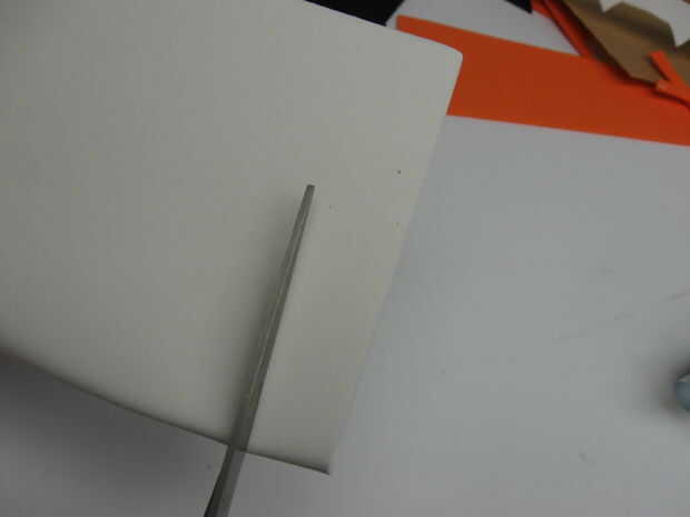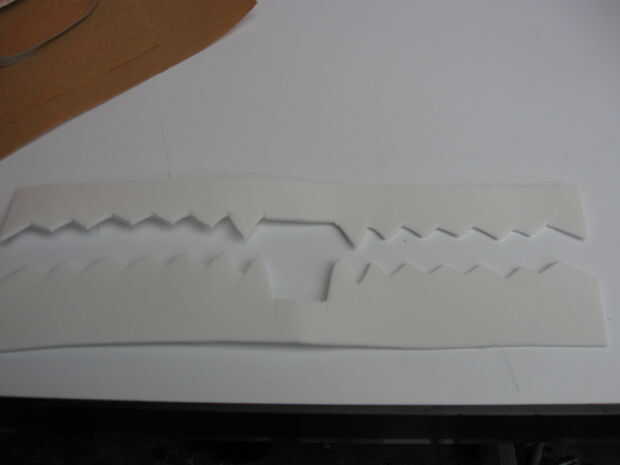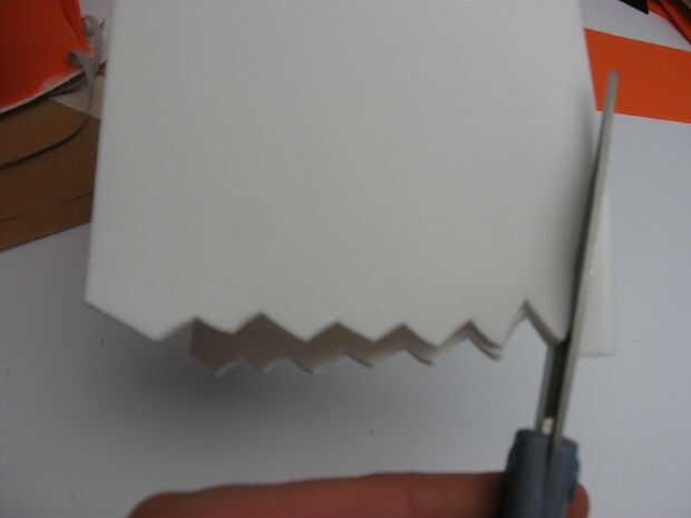 Doblar la espuma antes de empezar a cortar para obtener una línea incluso... El diente delantero inferior de mandíbula tendrá que ser cortado después de la sección de dientes superiores.