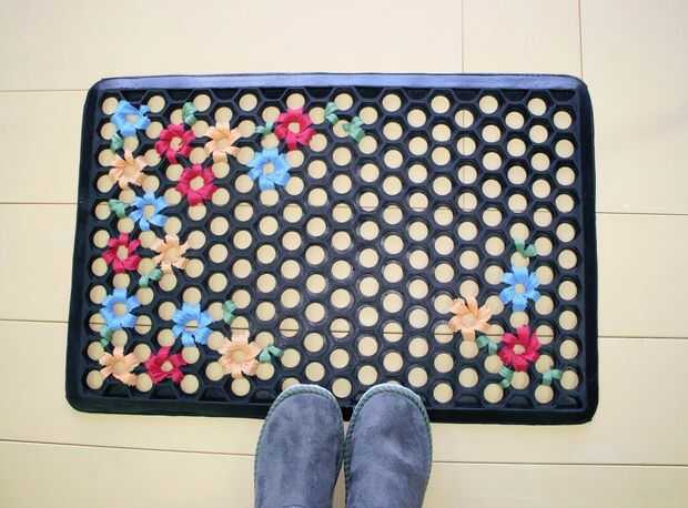 Si necesitas algo útil pero invita, aquí es una manera fresca para añadir color y ternura a una estera de goma negro barato. Es una manera de decir "Bienvenidos", sin las palabras. Las flores y hojas tejidas en esta estera están hechos de Maillots antiguos niños. Usted puede utilizar cualquier tipo de algodón pero material de elástico de algodón es necesario tejer alrededor de los orificios fácilmente. Usamos camisetas para las flores y una camiseta vieja para el verde deja (porque no teníamos camisetas verdes). La estera de goma con agujeros circulares vinieron de la Bunnings para menos de $10. Para el no australianos es una tienda de hardware/hogar/bricolaje caja grande