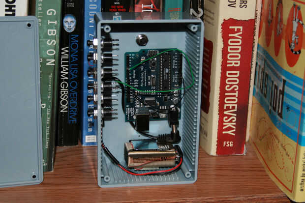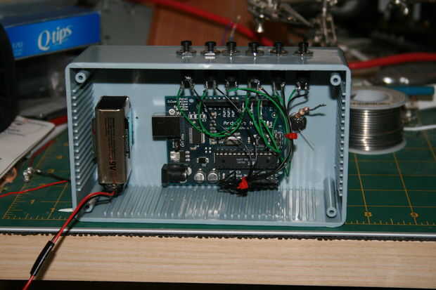 -Corte los orificios en la caja del proyecto para dar cabida a los 6 botones, 3 interruptores y el LED.