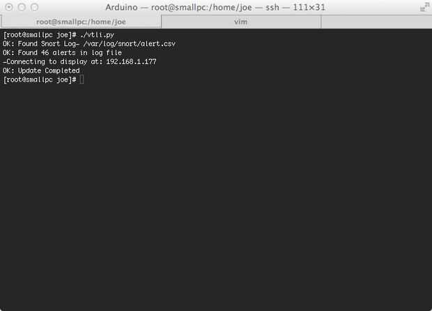 Prueba de que el proceso de python puede conectarse a Arduino. Asegúrese de apuntar al log de Snort y Arduino.