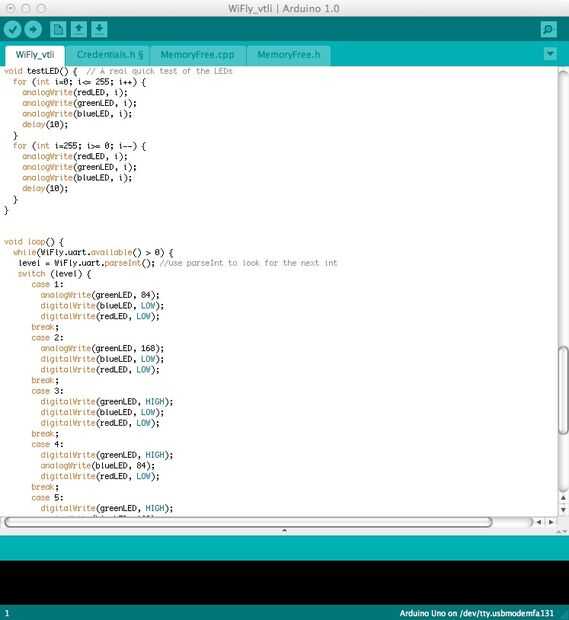 Tendrá que descargar el código de WiFlySerial de arduinology.tumblr.com. Copie los archivos WiFlySerial.cpp y WiFlySerial.h en la ruta de biblioteca de Arduino (en un mac es: /Applications/Arduino.app/Contents/Resources/Java/libraries/). A continuación abra vtli-wifly.ino en el IDE de Arduino. Se desea importar los archivos Credentials.h y MemoryFree.h a su proyecto.