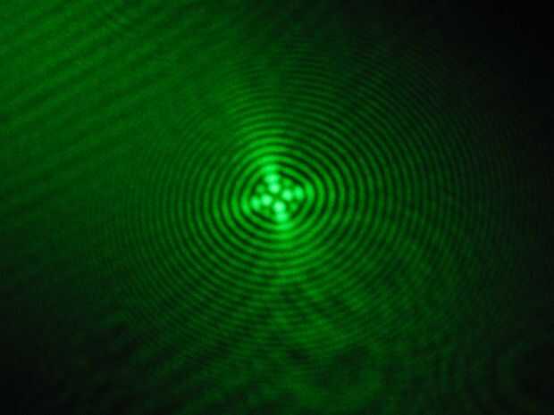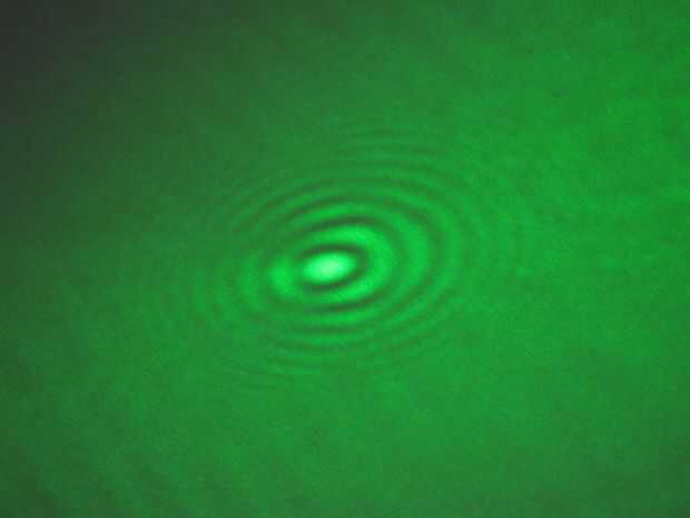 Frustrado por mi evidente falta de reproducir un experimento muy muy simple, que seguí trasteando con la posición del imán y el ángulo del láser hasta que logré bajar el laser rebote el espejo casi exactamente en el punto central de donde fue el efecto magnético sobre el agua. Aquí está el resultado. En realidad, hubo dos resultados. No a distancia (las imágenes fueron proyectadas en el techo de mi garaje) hubo un patrón diferente. Imagen #2 a continuación.