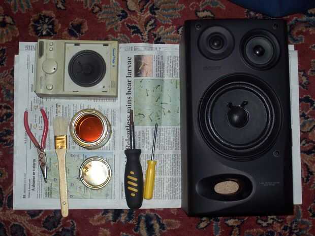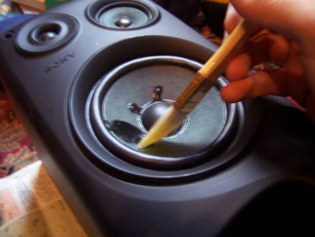 Por lo tanto, encontrar a su favorito (yo usé de poliuretano) de material de impermeabilización y aplique el cono del altavoz y la cúpula pero no la goma alrededor del borde del altavoz que permite que el cono a moverse. Por lo menos no a todo, no es un crimen si usted consigue un poco de allí.