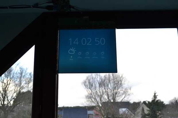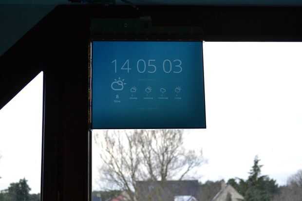 Es una vista agradable si mirar por la ventana y ver el jardín y en la parte superior izquierda de la esquina del tiempo, tiempo actual y Previsión del tiempo.