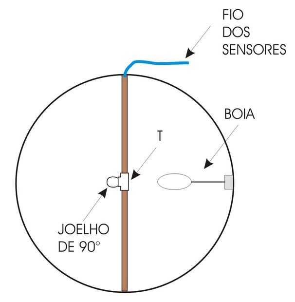 Hice un soporte, junto con la barra con los sensores en forma de ' t ' como se indica. Los cables pasan dentro del tubo (esta es la parte más difícil). Trate de colocar los sensores de manera que el agua en la caja de la válvula de flotador no pase por los sensores para generar no complementado.