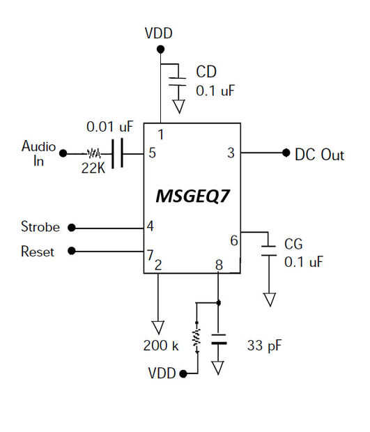 El IC MSGEQ7 es una banda de siete solo canal filtro de pantalla de ecualizador gráfico. Por la alimentación de una señal de audio a la misma, filtrará siete bandas de frecuencia centrado alrededor de 63Hz, 160Hz, 400Hz, 1, 000 Hz, 2, 500 Hz, 6, 250Hz y 16, 000Hz. Las siete frecuencias son pico detectado y multiplexado a la salida para proporcionar una representación continua de la amplitud de cada banda. Todo lo que necesitamos es leer estos valores de DC con el analógico del microcontrolador de entrada y salida del espectro a las pantallas de matriz de LED 3D. Necesitamos dos MSGEQ7 ICs, uno para la izquierda y otro para el canal derecho de audio. El esquema de conexión arriba muestra cómo un MSGEQ7 IC está conectado normalmente.