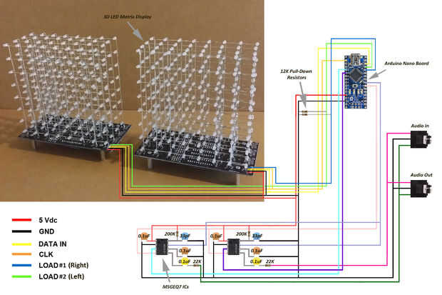Los dos conjuntos de pantallas 3D LED de matriz completadas en el paso 1 están conectados junto con los dos MSGEQ7 ICs y micro controlador como se muestra en el esquema anterior. Un Arduino Nano se utiliza aquí para controlar la configuración de todo circuito electrónico. Tenga en cuenta que el uso de resistencias de pull-down de 12Kohms en los pines de entrada de carga de la matriz de LED 3D muestra. Cuando primero se aplica la alimentación para el microcontrolador o cuando se reinician, flotan sus líneas de la entrada-salida. MAX7219 ICs de la pantalla de matriz de LED 3D puede ver esto como datos válidos y mostrar la basura hasta el control de ganancias de micro controlador. Las resistencias de pull-down prevenir estos problemas.