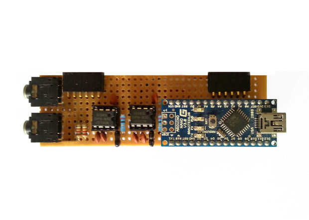 Excepción de los dos conjuntos de pantallas de matriz de LED 3D, enganchamos el circuito entero en un pequeño trozo de perf-junta alrededor de 110 x 30 mm. Vea arriba para nuestro circuito completo a bordo del perf. Nota hay dos tomas de audio estéreo de 3,5 mm en el diagrama de cableado. Uno sirve como una entrada de audio estérea y el otro es una salida de paso que le permite conectar este visualizador de espectro Audio en línea entre su fuente de audio y su sistema estéreo.