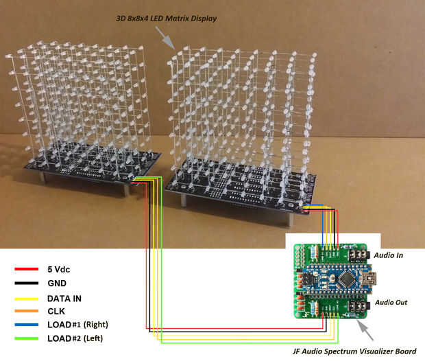 Sube el programa visualizador de espectro de Audio 3D a tu Arduino Nano. Luego conecte el tablero visualizador de espectro de Audio a las dos pantallas de matriz de LED 3D. Ver la foto de arriba para las conexiones.