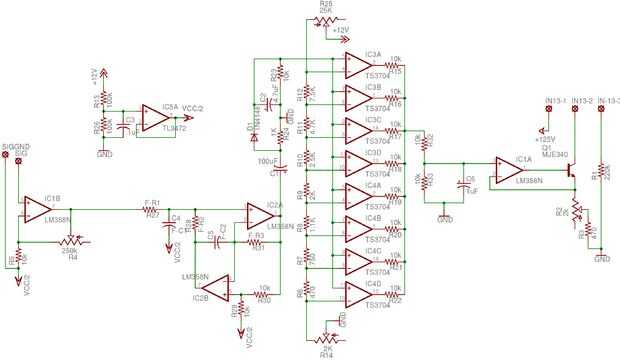 El segmento medio tiene la toma de entrada de audio, amplificación para los canales izquierdos y derecho, el poder de 6V y el divisor de tensión para todos los circuitos de log-lin.