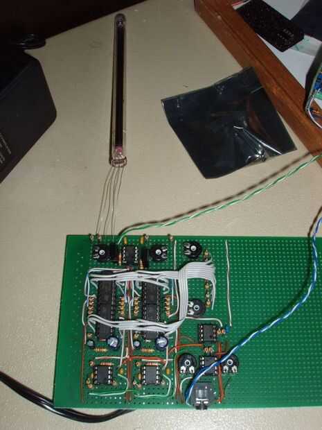 Una matriz de siete resistores y dos potenciómetros se arregla como un divisor de tensión para generar los voltajes de referencia necesario. Para cada banda, ocho comparadores de tensión (en forma de dos quad comparator ICs, utilicé STMicroelectronics TS3704) Comparar la señal a estas referencias para determinar un nivel de volumen lineal. Entonces son un promedio de las ocho salidas de los comparadores con resistencias de 10K ohm, dando un rango de valores de 0V a 12V con cada paso de 1.5V 2.1dB alrededor del mismo.