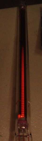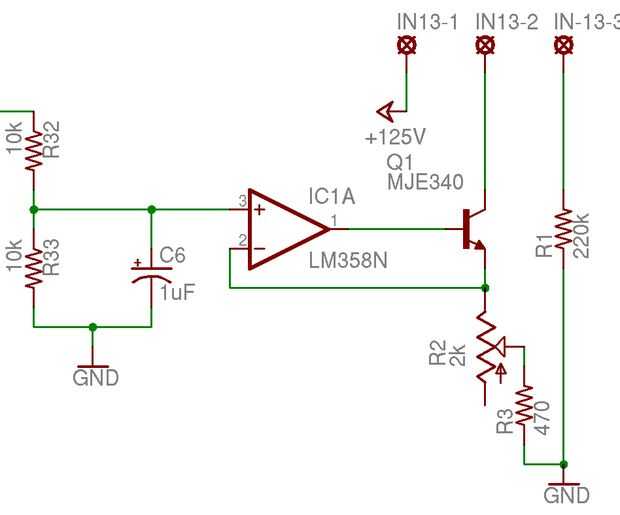 El tubo nixie tiene 3 pines, un ánodo, un cátodo de control y un cátodo auxiliar. El ánodo está ligado a la salida de una fuente de alimentación de alto voltaje en alrededor de 125. El cátodo auxiliar está ligado a la tierra a través de una resistencia de ohm 220 k. Lo puedo decir, el auxiliar cátodo actúa como una especie de piloto, forzando el tubo para empezar a brillar en un extremo, en lugar de la media o el otro extremo. El cátodo de control es el tubo principal, y la corriente a través de ella determina la longitud del tubo que se enciende. Un transistor de NPN alto voltaje modula la corriente desde el cátodo de control a través de un resistor de 470 ohm y potenciómetro (para propósitos de tuning). La ensambladura del emisor de base del transistor tiene una sesgada tensión de sobre 0.65V que necesita para encender, un op-amp se emplea para ajustar la señal para esto.