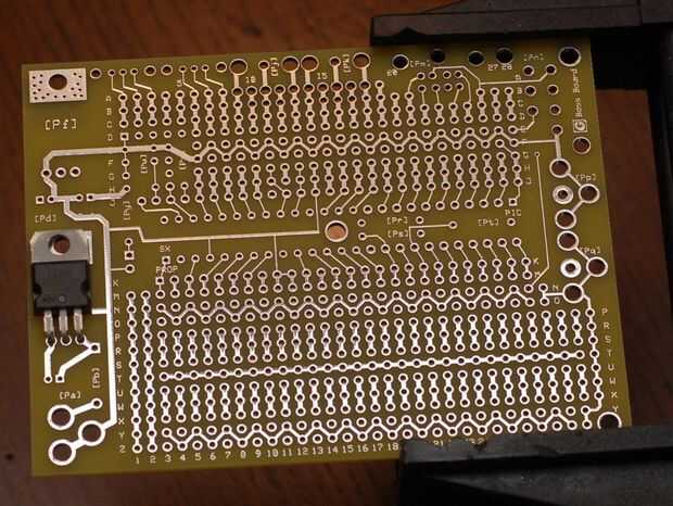 El regulador se introduce como se muestra en la imagen. Nota cómo la ficha se alinea con el cuadrado de metal desnudo. Utilice un poco de soldadura ' virar ' hacia abajo la lengüeta a la Junta, este actuará para disipar el calor. Una vez que se inserta el regulador, voltear el tablero, las patas a la Junta de la soldadura y recorte la punta sobrante.