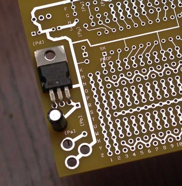 Un capacitor entra en el área marcado [Pa]. Compruebe las indicaciones del caso para verificar el valor. Debe ser 10uF. El condensador es polaridad sensible, por lo que asegúrese de que el cable más largo pasa por el agujero cuadrado. Otra manera de verificar es la tira en el caso del condensador esté más cerca del borde del tablero.