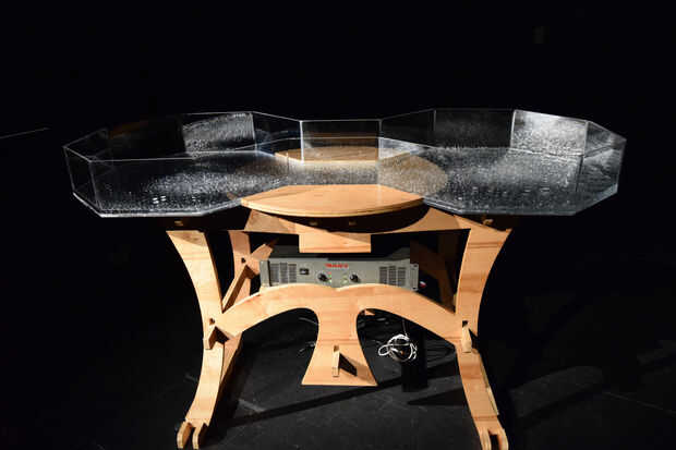 El visualizador de tanque de agua cymatic cualquier sonido o datos en forma de archivos de sonido y juega a través de graves altavoces "Buttkicker" a vibrar un tanque lleno de agua. Diferentes frecuencias excitan distintos modos de vibración del tanque y causan diferentes tipos de patrones en el agua.