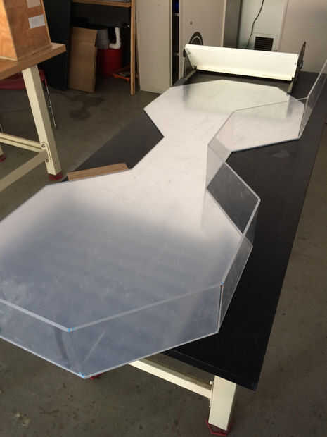 Los lados fueron hechos de dos tiras largas de acrílico que usamos un calentador de tira y pistola de calor para hacer flexible y una forma para moldear en los ángulos correctos para que coincida con la base. Se encontró con tres personas trabajando en esto fue esencial para manipular el acrílico. No calor del acrílico demasiado o de lo contrario obtendrás burbujas formando.