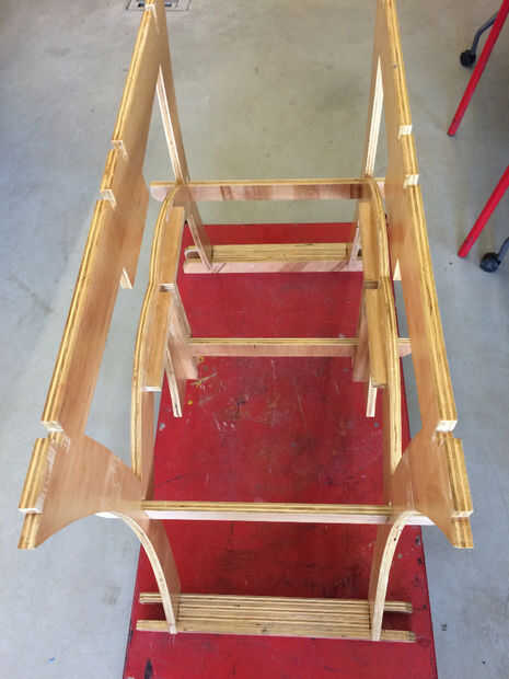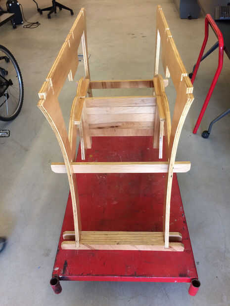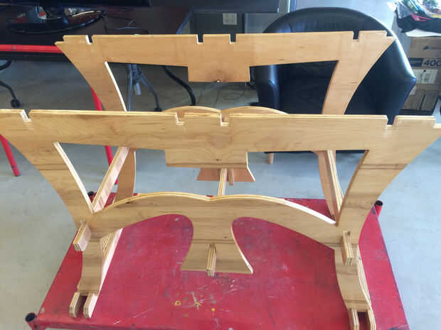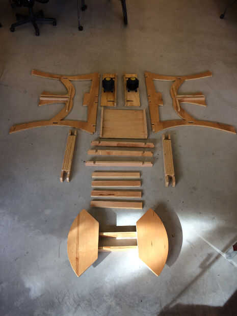 Las partes fueron cortadas de 3/4" arce contrachapado chapas en un molino de ShopBot CNC en TechShop. Todo fue cortado de una hoja de madera contrachapada de 4'x 8'.