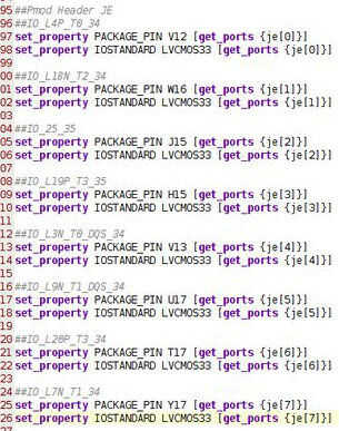 Finalmente, encuentra la sección denominada "Pmod encabezado JE". Elimine todas las líneas "set_property" en esta sección también. No necesita cambiar los nombres.