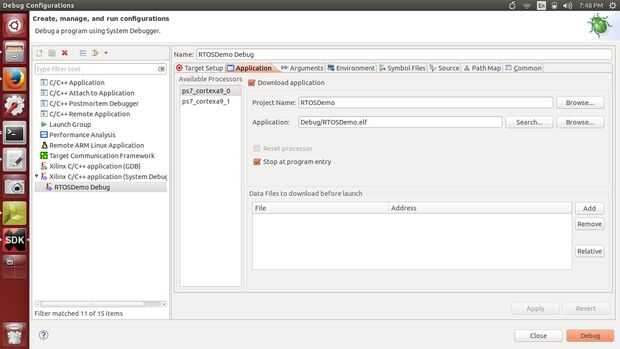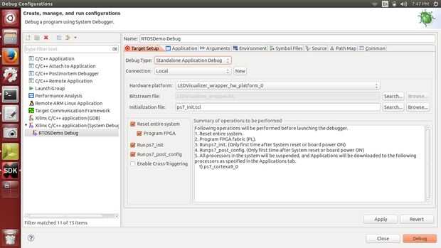 Seleccione la pestaña de "Aplicación de Xilinx C/C++ (sistema depurador)" en el lado izquierdo de la pantalla. Bajo "Configuración del destino", compruebe "Resto todo el sistema" y asegúrese de comprobar "Programa FPGA". Luego seleccione la pestaña de aplicación y comprobar "Pare en la entrada de programa". Haga clic en aplicar. Haga clic en depurar aún no, sólo cierre la ventana.