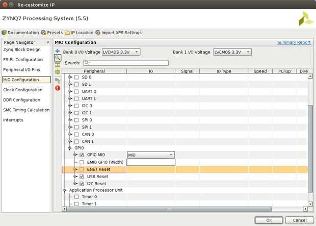 Ahora haga clic en la pestaña de "Configuración del MIO" en el lado izquierdo de la pantalla. Expandir "Periféricos de E/S". Compruebe ambos "SD 0", "ENET 0", y "UART 1". Luego expandir "GPIO" dentro de eso. Marque la casilla "GPIO MIO". Algunas otras cajas serán comprobado, así que está bien. Luego expandir "Unidad de procesador de aplicación" y comprobar "tiempo 0" y "Vigilante".