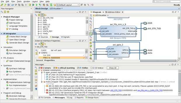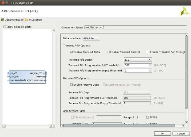 OK, ahora tenemos que añadir algo que llama un bloque fifo AXI. Se trata de una cola que se utiliza cuando es necesario el software escribir información de LED para el bloque de hardware LED. Haga clic derecho sobre algún espacio en blanco y hacer clic en "Agregar IP". Esta vez escribe en "FIFO" y seleccione el "AXI flujo FIFO". Haga doble clic en el bloque recién agregado y se abrirá una ventana de configuración. Seguir adelante y deseleccionar "Activar Control de transmitir" y "Habilitar recepción de datos". Haga clic en aceptar y haga clic en "Ejecutar la conexión automatización" otra vez. Haga clic con el botón derecho el puerto AXI_STR_TXD y seleccione "Hacer externos". Sólo puede dejar el nombre como es.
