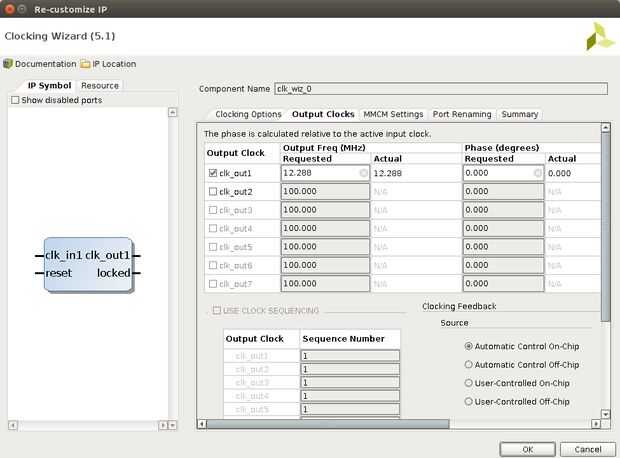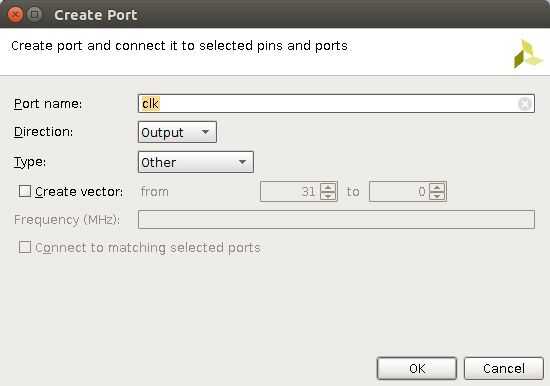 Tenemos que crear una fuente de reloj 12,288 MHz para el códec de audio. Haga clic derecho y algunos espacios en blanco, haga clic en "Agregar IP" y escriba en "reloj". Seleccionar "sincronización". Haga doble clic en el bloque recién creado. Haga clic en la pestaña de "Relojes de salida" y cambiar la frecuencia solicitada a 12,288 MHz entonces haga clic en Aceptar. Pasa el cursor sobre la línea negra que sale del puerto de FCLK_CLK0 en el bloque ZYNQ y arrástrelo hasta el puerto de clk_in1 del bloque de Asistente para sincronización. Haga clic derecho sobre el puerto de clk_out1 y seleccione "Hacer externos". Nombre el nuevo puerto "clk_audio_master". Vamos a tener que crear otro puerto de reloj, así que es sólo el principal. Haga clic derecho sobre el espacio en blanco otra vez y seleccione "crear puerto". El nombre "clk", cambiar la dirección de salida y haga clic en Aceptar. Mueva el ratón sobre el puerto y arrastre a "FCLK_CLK0" en el bloque ZYNQ.