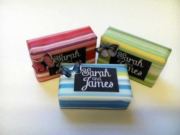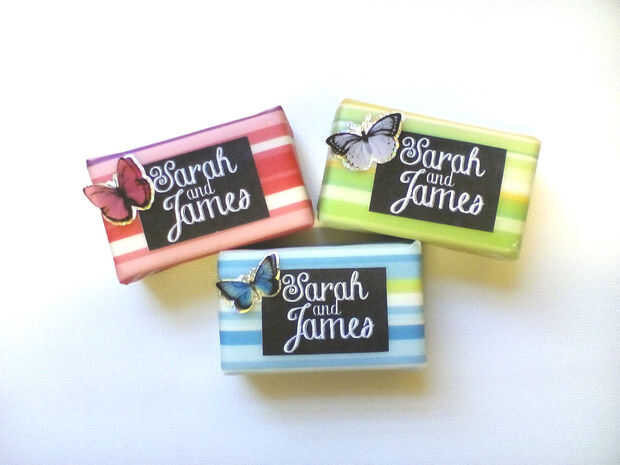 Pensé que jabones hechos a mano sería un favor de la gran boda para dar a los huéspedes... pero que muchos jabones muy lentos! Entonces pensé que debe haber una manera de hacer jabón comprado de tienda mirada tan bonita y personalizada para celebrar su día especial. Me encanta la manera en que el papel vitela es translúcido, para que pueda ver el jabón apenas asomando a través de, y los colores, aunque brillantes y crujientes, son ligeramente más suaves que el áspero papel colores sería. También me gusta la forma en que se siente vitela - es nítida y embalaje-como, más difícil de usar de papel (de modo que sobrevivirá el viaje casero!) todavía conserva el ambiente hecho a mano. Podrían hacer éstos para coordinar con cualquier tema de la boda o su esquema de color elegido y agregar adornos adecuados para emparejar, pero caí en amor con las rayas brillantes de este papel de vitela.