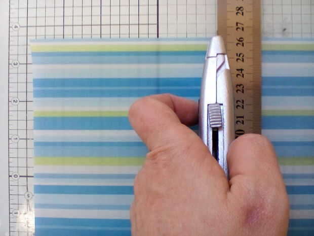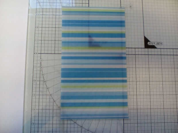 Utilizando la barra de jabón como guía (porque cada marca tiene un tamaño diferente!) ajuste hacia abajo de la vitela a un tamaño adecuado para envolverlo. Si la vitela tiene un patrón, como mina, ser conscientes de la dirección del patrón cuando usted corta. Usted puede utilizar tijeras o un cuchillo y regla, cualquiera que se sienta más cómodo con. Para precisión, prefiero utilizar un cuchillo con una cuchilla afilada, una regla y una almohadilla de corte de vidrio.