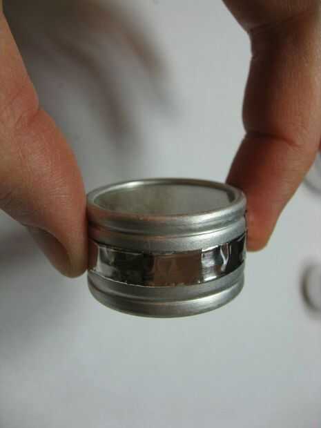 Despegue el revestimiento de la cinta de papel de aluminio. Coloque la cinta en la costura entre las dos tapas de lata. Envuelva la cinta alrededor de las latas y asegúrese de que el sello está apretado. Frotar la cinta con la parte posterior de la uña para asegurarse de que se adhiere al aluminio de las tapas de la lata.