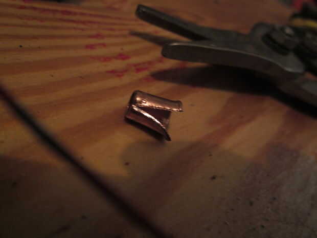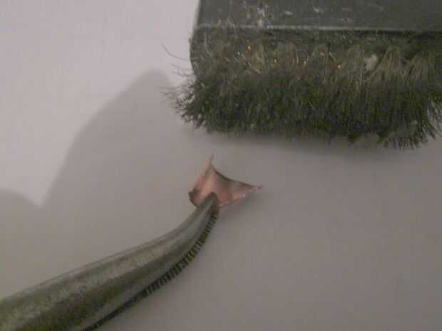 No pudiendo encontrar una manera sencilla, con lo que tenía en casa, dirigió una ferretería y vino para arriba con los plegadores cobre poco, como fino cobre tubos realmente y trajeron a casa. Cuidadosamente, cortarlos por la mitad (un lado en un momento), que terminó con dos tubos de medio de cobre brillante (bueno, el interior no fue excesivamente brillante, tenía un recubrimiento opaco algo en él, usé una aguja de nariz alicates para sostenerlo y cepillado con un cepillo de alambre hasta que BRILLABAN :-)