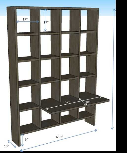 Este proyecto está hecho de madera maciza de roble blanco cuarto aserrada. El espesor final de las tablas es 1 ½". El tamaño total de este proyecto es 6' 6 '' ancho, 8' 6" altos y 13" de profundidad. Los cubbies del estante son cuadrados de 17". El escritorio voladizo es 57" de largo y 18" de ancho. La metodología de construcción básica es mortaja y espiga empalmes. Levas mecánicas se utilizan para unir las secciones fuera de la caja.
