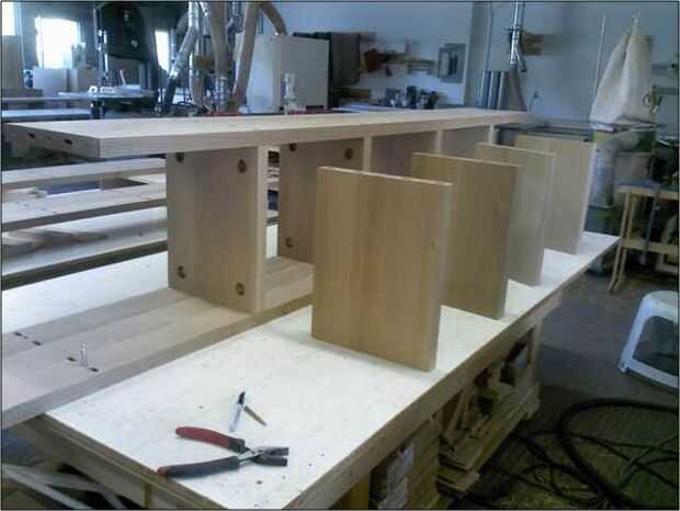 Las piezas horizontales superior e inferior se unen con pernos ½" a través de orificios perforados a través de las caras exteriores de los divisores verticales mediados tres. Los extremos de la parte superior e inferior tienen cámaras que se conectan a los lados. Estos están empotrados en un agujero de fondo plano.