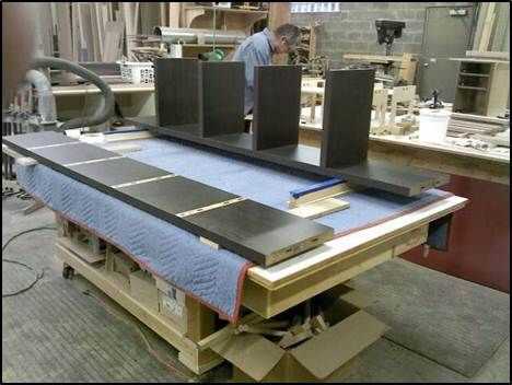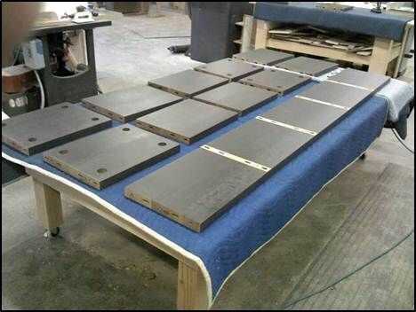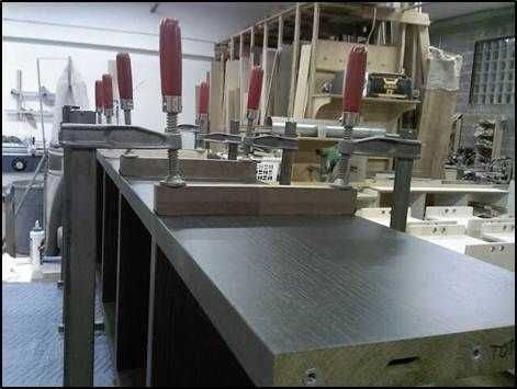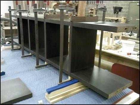 Diseño de las abrazaderas que se utilizará. Han mojado trapos para limpiar pegamento squeeze-out. Lugar uno de los divisores verticales en las canalizaciones verticales para levantar de la mesa tan abrazaderas y cauls pueden ser lugar debajo.