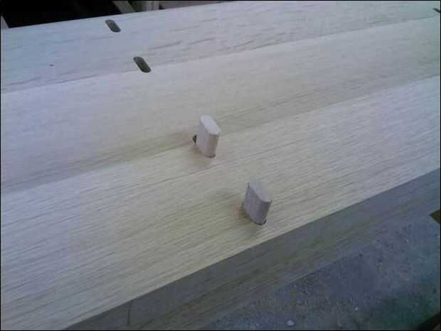Uno de los estantes y fije una cuña al final. Asegúrese de que la cuña esté fijada firmemente al final de la plataforma. Esto servirá como una referencia para que el estante esté al ras con la parte superior del divisor vertical. Este estante se utilizará sólo para cortar el primer conjunto de mortajas en cada uno de los divisores verticales.