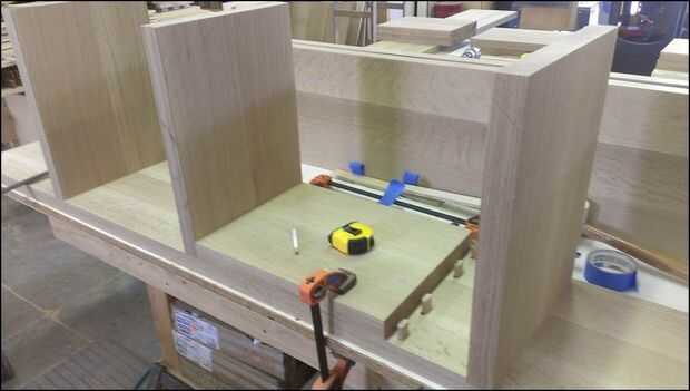 Una vez que se corta el primer conjunto de mortajas, colocar espigas en las mortajas y fijar un estante en las espigas. Esto establecerá el siguiente conjunto de mortajas.