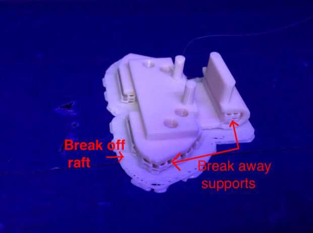 Una vez completada la impresión romper la balsa y las ayudas utilizando alicates de punta y un cuchillo de la manía.