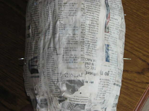 Tuve algún alambre de aluminio grueso tendido sobre, pero creo que un perchero funcionan bien también. Me hizo una "L" de la curva en un extremo del alambre, penetra a través de todo el camino y por el otro lado. Hice una curva de "L" final y recortar el exceso. El propósito de las curvas de "L" era evitar que el cable salga mientras aplicamos el papel crepé. En retrospectiva, usted podría probablemente salirse con sólo añadir un poco de pegamento a cada extremo.