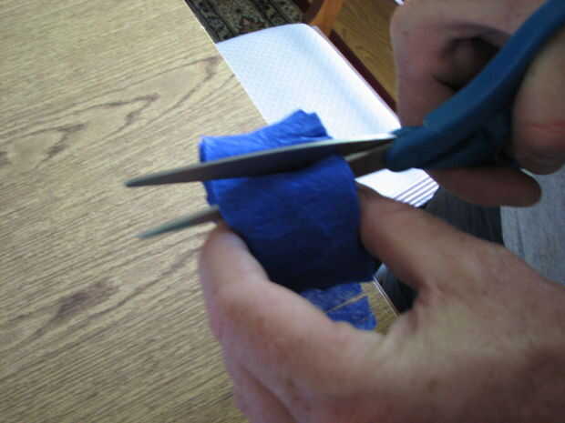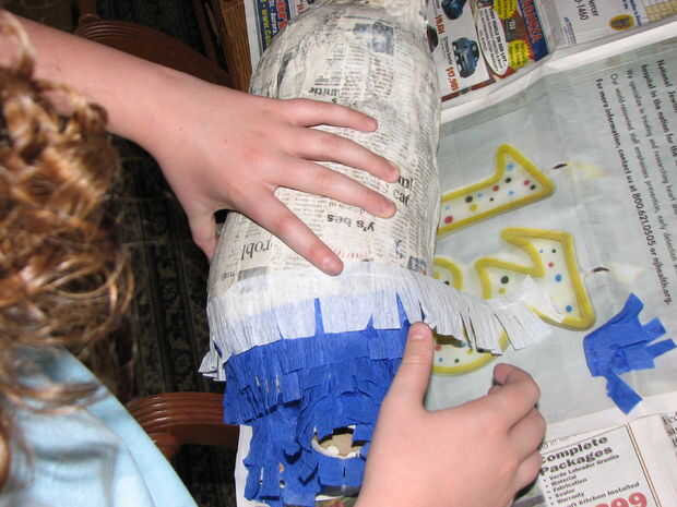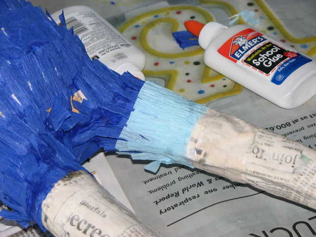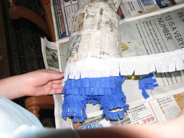 Comenzamos en la base y nuestro camino a la cima.  Poner una fina línea de pegamento blanco en la parte sin cortar el papel crepé y Envuélvala alrededor de la Sherbat.  Utilice pequeños de longitud para las piernas y los largos para el cuerpo.  Encontramos que el papel crepe azul blanco y ligero fue muy transparente y sus rayas tomaron una capa extra para evitar que el periódico mostrando a través de.