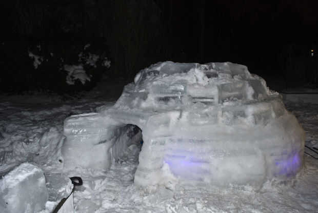 he construido un iglú de hielo sólido de 8000 libras con iluminación led, un sistema estéreo y conectividad iPod. Puse un colchón inflable dentro y planeaba pasar la noche en él, pero por desgracia, no cubrirlo durante una tormenta de lluvia de freak y había derretido durante la noche 24 horas después de la terminación.