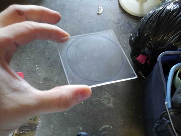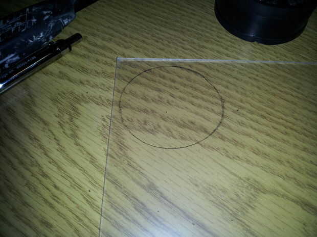 Una vez que la tapa se prestan temporalmente inútil, entonces fui capaz de pegarse un marcador en el orificio y trace el diámetro interior de la tapa sobre el material de la lente. Sólo voy a cal lo "Material de la lente" de ahora en adelante porque no sé cómo se llama realmente.