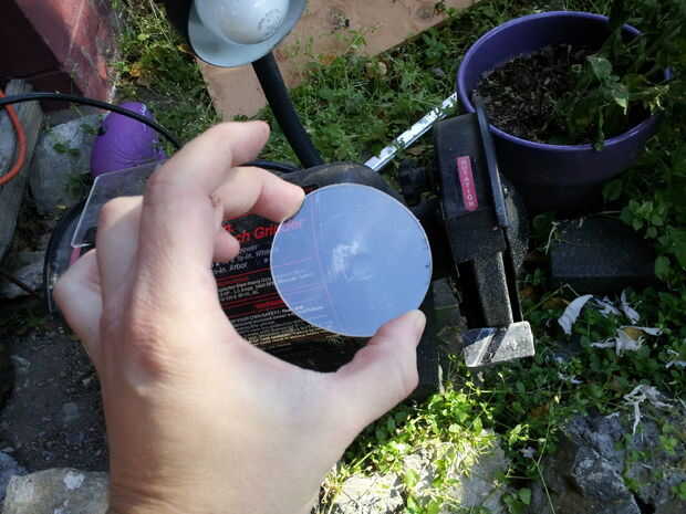 Usando mi antigua amoladora de banco, quitar las esquinas y el exceso de Material alrededor de mi círculo trazado. Tenga cuidado al utilizar cualquier herramienta. Amoladoras de banco le llevará del dedo de su, destrozarlo y tiro a través de la tienda. O incrustar en su torso. También utilizar gafas de seguridad o algo. Utilizando una esmeriladora de banco de esta manera poco ortodoxa produce pequeños pedacitos voladores caliente, cerca de líquido del Material de lente.