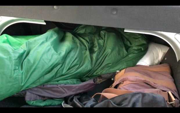 Dormir con la cabeza en el tronco y los pies en los asientos traseros. He encontrado esto para ser la posición más cómoda. Me sentí más segura porque un transeúnte sólo vería un saco de dormir. También esta corte los faros de coches o el aerosol de la luces de la calle que pasan.