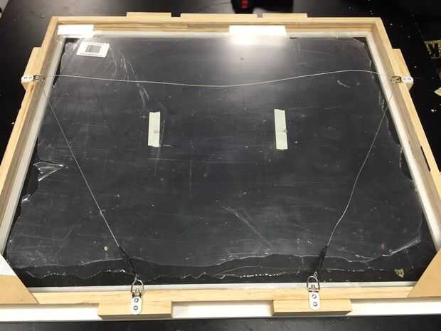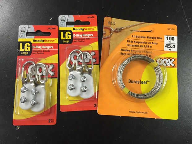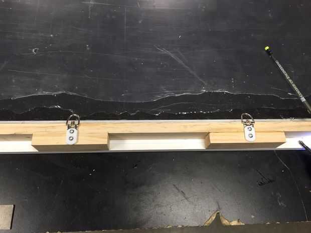 Hice algunas investigaciones y descubrió el peso aproximado de un pie cúbico de arena húmeda. Luego determina el volumen de la caja (al nivel que pretende llenarlo) y calcula que el peso de la arena sería aproximadamente de 18 libras. Con el peso de la estructura que rendiría un peso total de alrededor de 40 libras. Sólo para estar seguro mientras que colgarlo, optamos por con foto colgante cable por 100 libras. Colocamos ganchos en los laterales y parte inferior. Así, mientras que se queda colgado, se apoyará la parte inferior del marco.