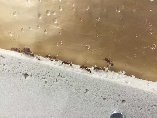 Después de esperar ansiosamente nuestras ants de llegar, está finalmente aquí! Colgamos el gabinete en la pared con varias suspensiones de servicio pesado. La arena en el recinto debe estar ligeramente humedecido así que vierte algo de agua y esperando a adsorber. Por último, hemos introducido las hormigas a su nuevo hogar con varios pedazos de restos vegetales. Durante la noche, las hormigas comenzaron hacer un túnel a través de la arena!