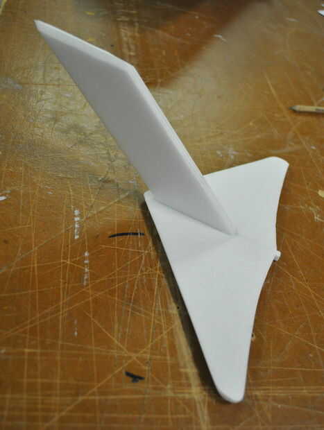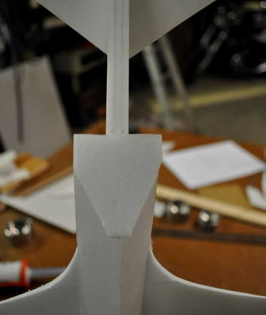 TOT ranura wordt het overschot aan y aan de achterkant van de staartvleugel schuin weggesneden. ER wordt nog een driehoekje sobre gelijmd om de staart af te dichten.