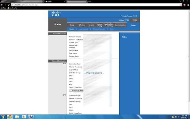Una vez que introduzca la contraseña correctamente debe parecerse a la imagen de arriba. Luego ir a "Estado" se encontrará "Puerta de enlace predeterminada" en el lado izquierdo (para mí) debajo de IPv4 en el lateral de la página. Es su dirección IP.