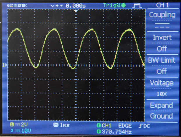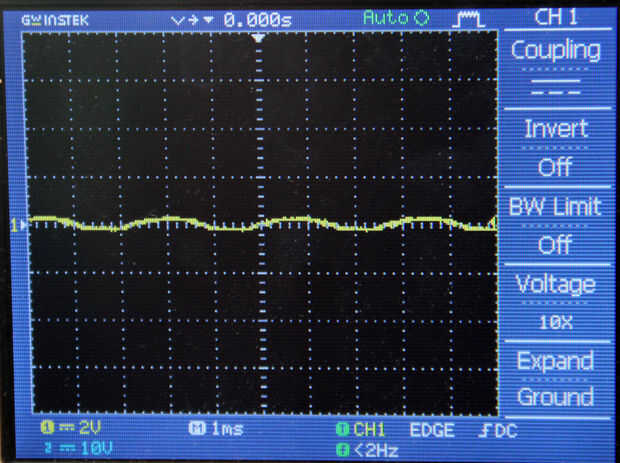 La figura 3 muestra la misma señal de micrófono después de amplificación, puede ver cómo ha aumentado la altura de los picos para que la onda oscila entre -2.5 y 2.5 V (amplitud de 2.5V). La Fig 4 muestra la señal después de haber estado DC offset; todavía tiene una amplitud de 2.5V, pero el punto central es 2, 5V en vez de 0V, por lo que la ola nunca cae por debajo de 0V. (Nota: el leve cambio en la forma entre las señales en la figura 3 y 4 es las cuotas a los cambios en mi voz entre las dos fotos, nada tiene que ver con el circuito). La señal en la figura 4 está lista para ir a una clavija de entrada analógica Arduino.