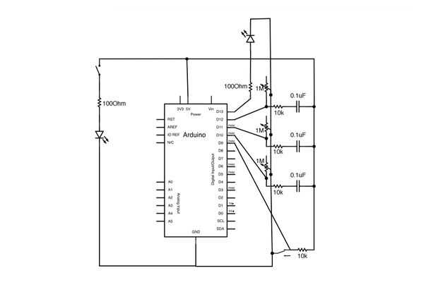El tercer esquema muestra cómo todos los controles de la caja de efectos están conectados con el Arduino. En este proyecto hay dos indicadores LED: indicador de un recorte y una salida. Tres ollas en el dispositivo de controlan de tamaño de grano, paso y mezcla wet/dry y un interruptor controla la dirección de reproducción de la muestra (adelante o atrás).