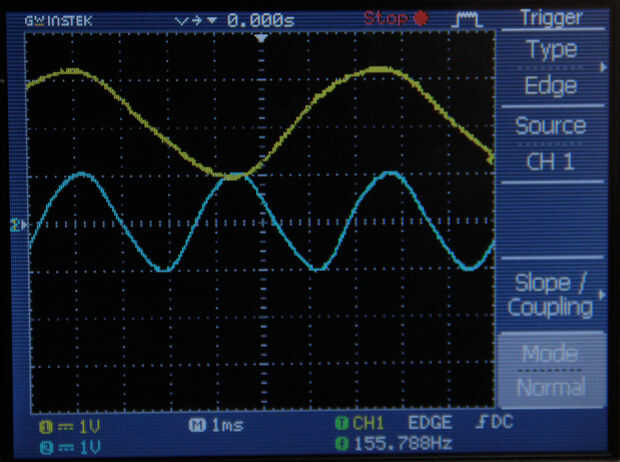 El código a continuación registra la sección corta de audio entrante en uno de los dos arreglos de discos: buffer1 y buffer2. También introduce una variable llamada "escala." Esta variable se utiliza a escala de la reproducción de audio almacenado buffer para cambiar la frecuencia. El código siguiente establece la escala a 2, esto duplica la longitud del tiempo que tarda la dac a la salida del audio almacenado. Como se puede ver en la imagen de arriba, la salida de la CAD (amarillo) es la mitad la frecuencia de la entrada del micrófono (azul).
